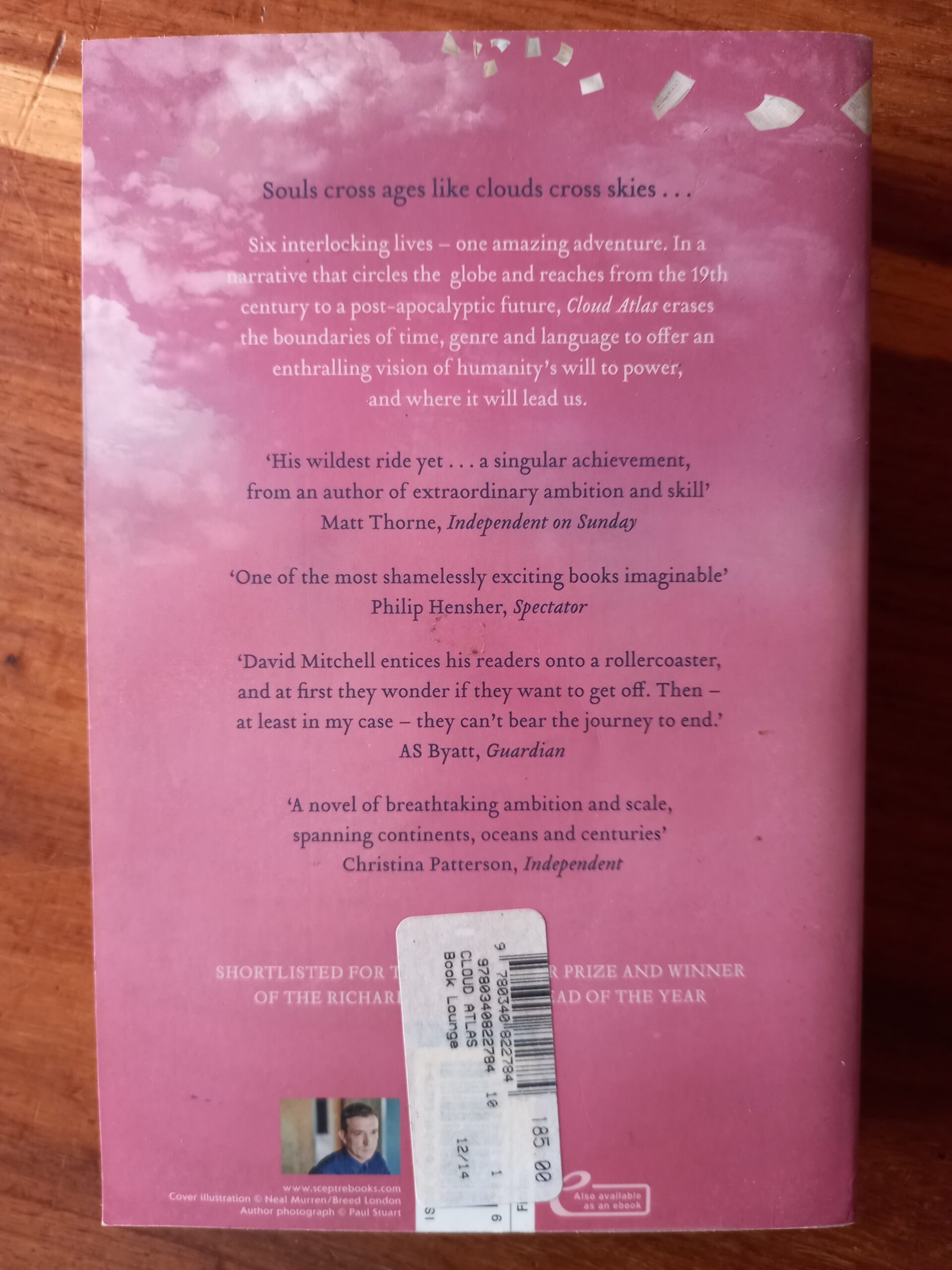But the story doesn’t end even there. The narrative then boomerangs back through centuries and space, returning by the same route, in reverse, to its starting point. Along the way, Mitchell reveals how his disparate characters connect, how their fates intertwine, and how their souls drift across time like clouds across the sky.