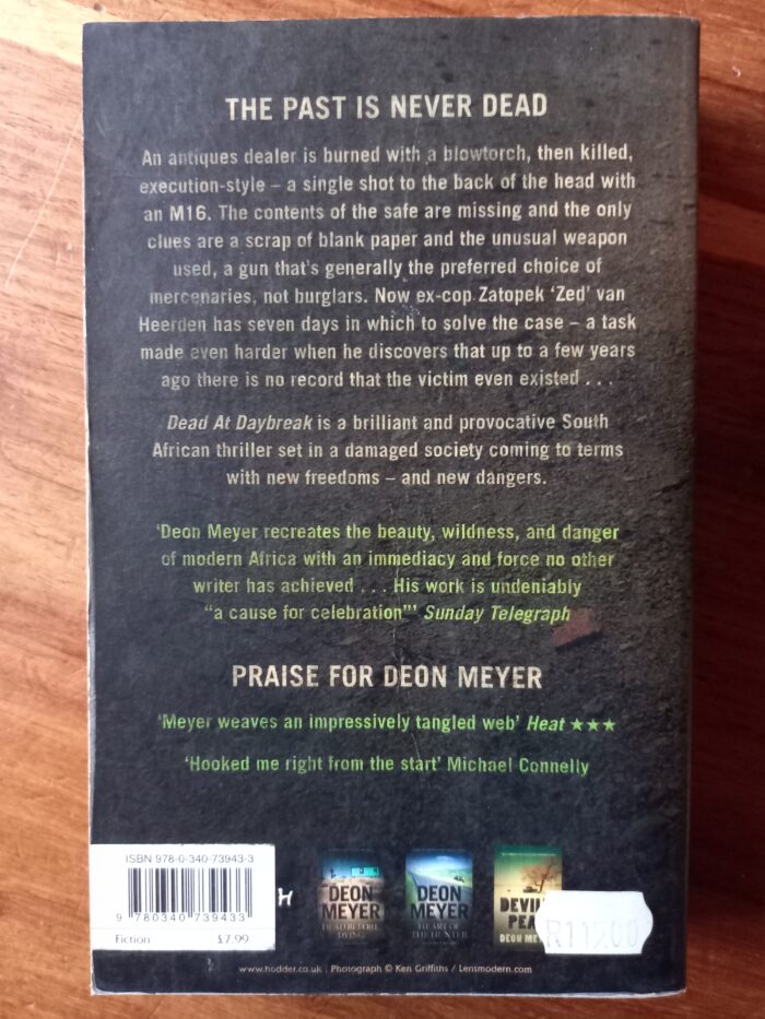 When Johannes Jacobus Smit, an antiques dealer, is found burned with a blowtorch and killed execution-style with a single shot to the back of the head, former cop Zatopek “Zed” van Heerden is called in to investigate the unusual circumstances of the murder. Zed is still obsessed with the betrayals of his own past but must fill in the blanks of this victim’s life.
