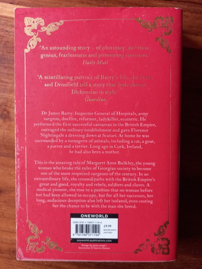 Dr James Barry: Inspector General of Hospitals, army surgeon, duellist, reformer, lady killer, eccentric. He performed the first Caesarean in Africa, was deported from St Helena and gave Florence Nightingale a dressing down in the Crimea. At home, he was surrounded by a menagerie of animals, including a cat, a goat, a parrot and half a dozen small terriers. Long ago, in Cork, Ireland, he had also been a mother.