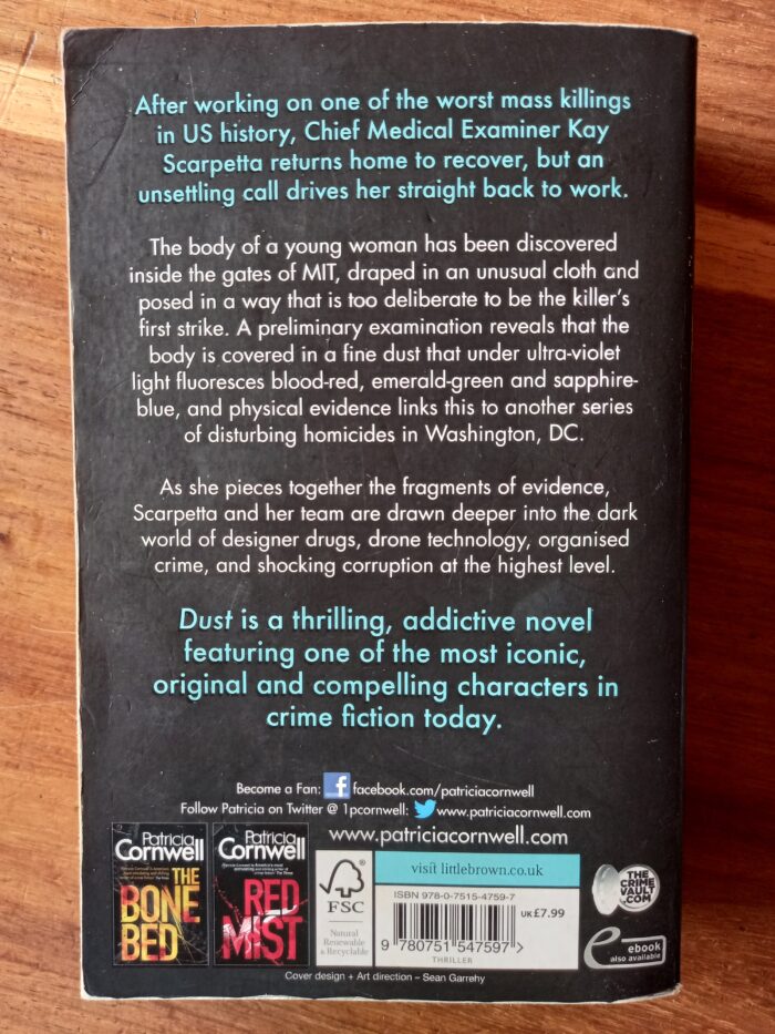 In Dust, Scarpetta and her colleagues are up against a force far more sinister than a sexual predator who fits the criminal classification of a “spectacle killer.” The murder of Gail Shipton soon leads deep into the dark world of designer drugs, drone technology, organized crime, and shocking corruption at the highest levels.