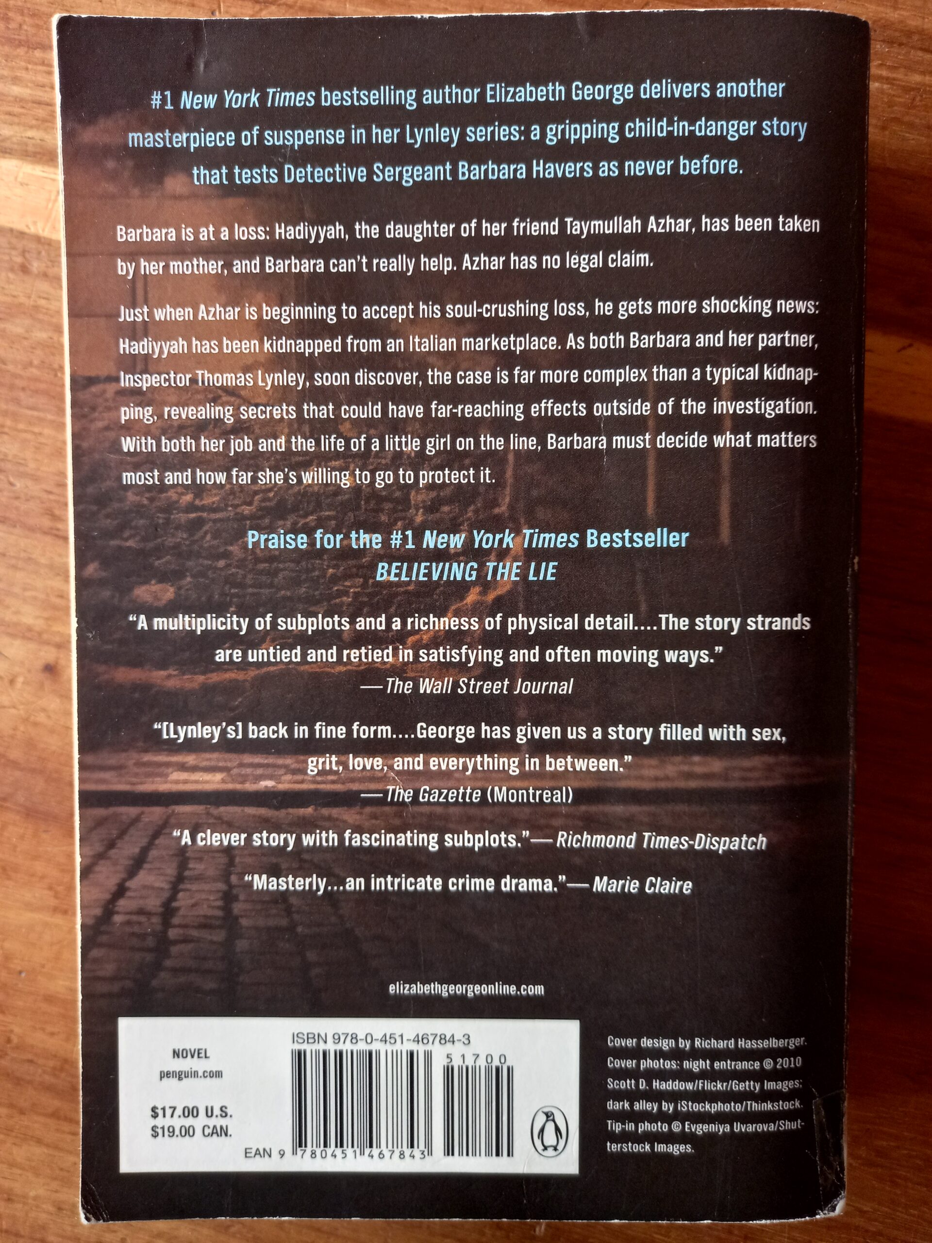 Sergeant Barbara Havers is at a loss: The daughter of her friend Taymullah Azhar has been taken by her mother, and Barbara can’t really help—Azhar had never married Angelina, and his name isn’t on Hadiyyah’s, their daughter’s, birth certificate. He has no legal claim. Azhar and Barbara hire a private detective, but the trail goes cold.
