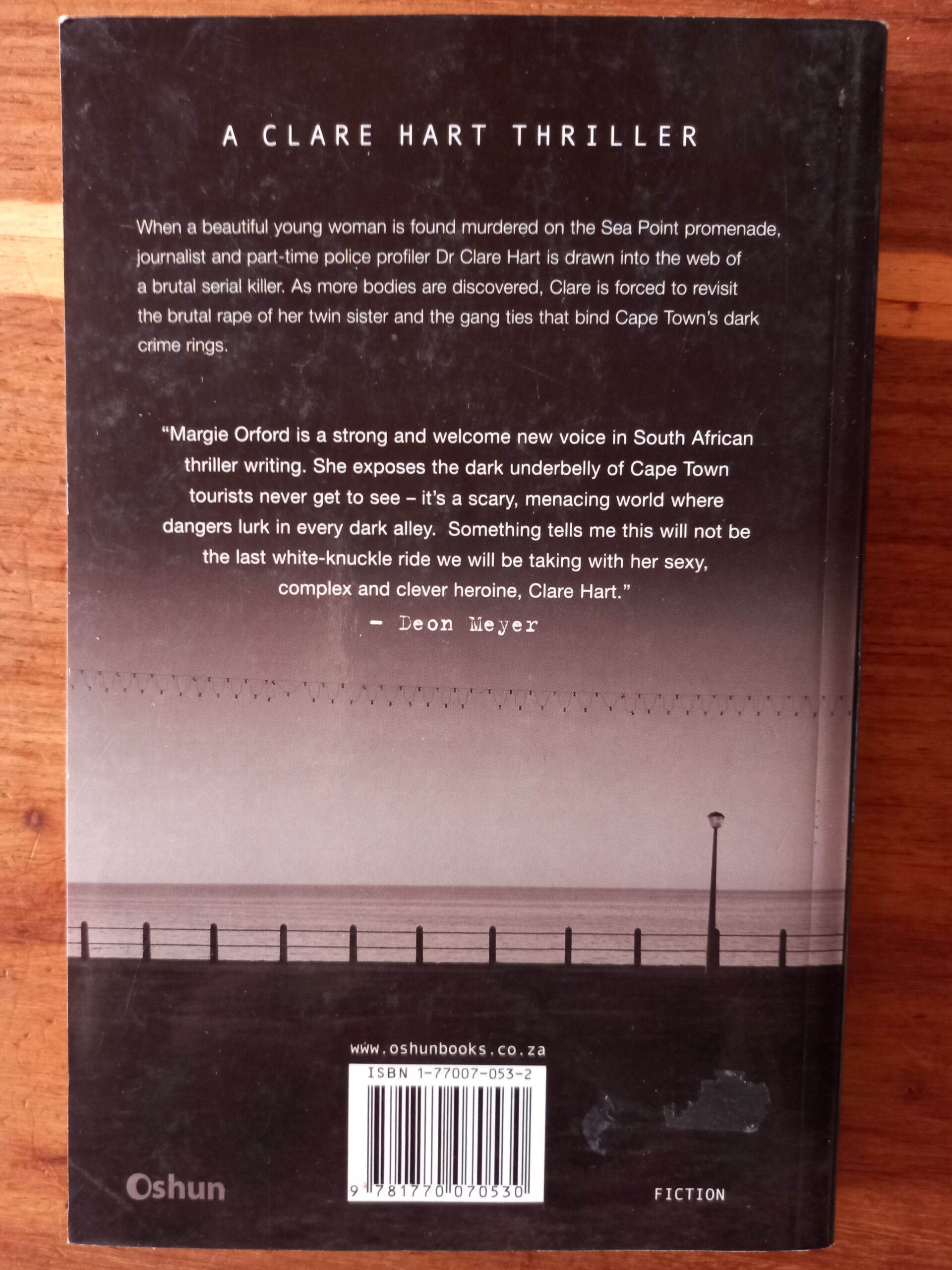 When a beautiful young woman is found murdered on Cape Town’s Seapoint promenade, journalist and part-time police profiler Dr Clare Hart is drawn into the web of a brutal serial killer. As more bodies are discovered, Clare is forced to re-visit memories of the brutal assault of her twin sister and the gang ties that bind Cape Town’s crime rings. Is her investigation into human trafficking linked to the murders or is the killer just playing a sick game with her?
