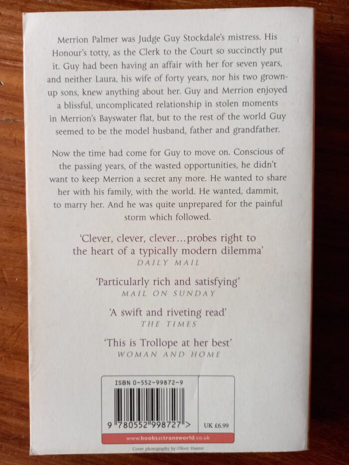 Guy Stockdale is a 62-year-old judge, who has been married forever, has two sons and three grandchildren. For the past seven years, he’s also had a mistress. Merrion Palmer is intelligent, attractive, and half Guy’s age, which also makes her younger than both Simon and Alan. Her dad died when she was a toddler and she’s well aware that Guy is something of a father substitute. For years the role of mistress has suited her, but, suddenly, this style of relationship isn’t enough for either of them. They’ve both had enough of sneaking around and avoiding people, so Guy has momentously made up his mind to leave his wife, Laura, and marry Merrion.
