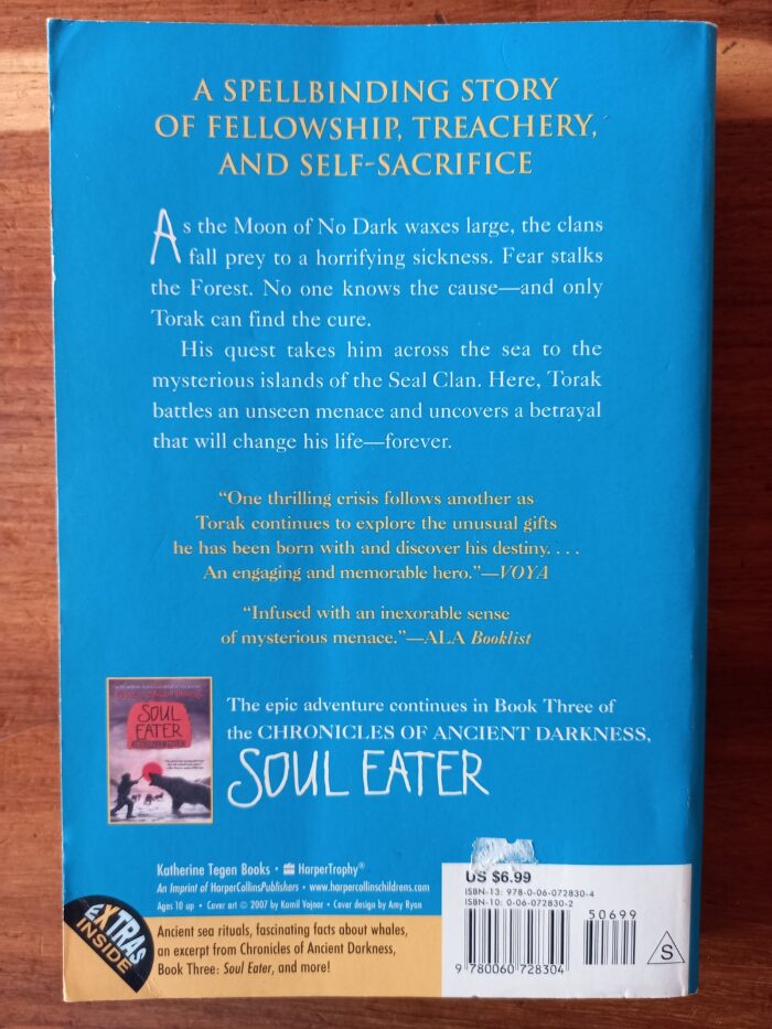 As the Moon of No Dark waxes large, the clans fall prey to a horrifying sickness. Fear stalks the Forest. The very breath of spring seems poisoned. No one knows the cause and only Torak can find the cure. His quest takes him across the sea to the mysterious islands of the Seal Clan. Here Torak battles an unseen menace and uncovers a betrayal that will change his life forever.