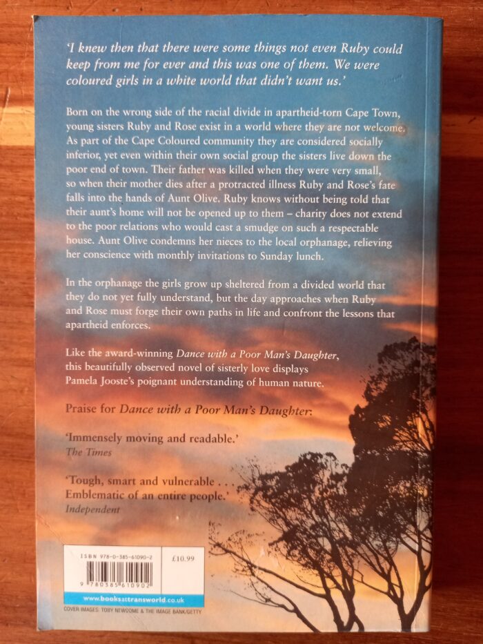 Born on the wrong side of a racial divide in apartheid-torn Cape Town, young sisters Ruby and Rose exist in a world where they are not welcome. As part of the Cape Colored community, they are considered socially inferior, yet even within their own social group the sisters live in the poor end of town. Their father was killed when they were very small, so when their mother dies after a protracted illness, Ruby and Rose’s fate falls into the hands of Aunt Olive. Ruby knows without being told that their aunt’s home will not be opened up to them – charity does not extend to the poor relations who would cast a smudge on such a respectable house. Aunt Olive condemns her nieces to the local orphanage, relieving her conscience with monthly invitations to Sunday lunch.