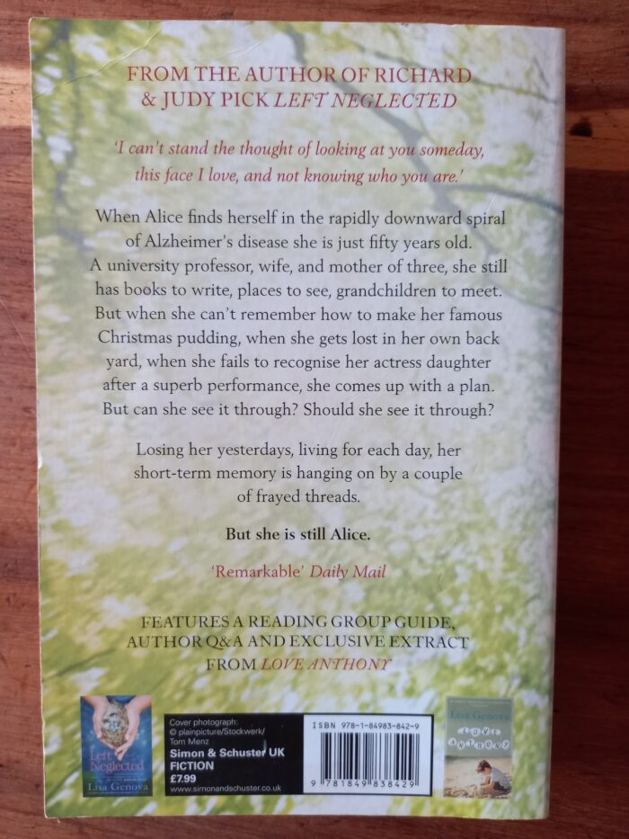 Still Alice is a compelling novel about a 50-year-old woman’s sudden descent into early onset Alzheimer’s disease, written by first-time author Lisa Genova, who holds a Ph. D in neuroscience from Harvard University.