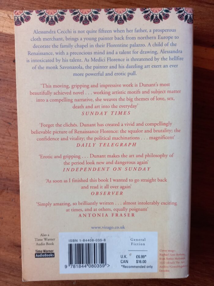 Alessandra Cecchi is not quite fifteen when her father, a prosperous cloth merchant, brings a young painter back from northern Europe to decorate the chapel walls in the family’s Florentine palazzo. A child of the Renaissance, with a precocious mind and a talent for drawing, Alessandra is intoxicated by the painter’s abilities.