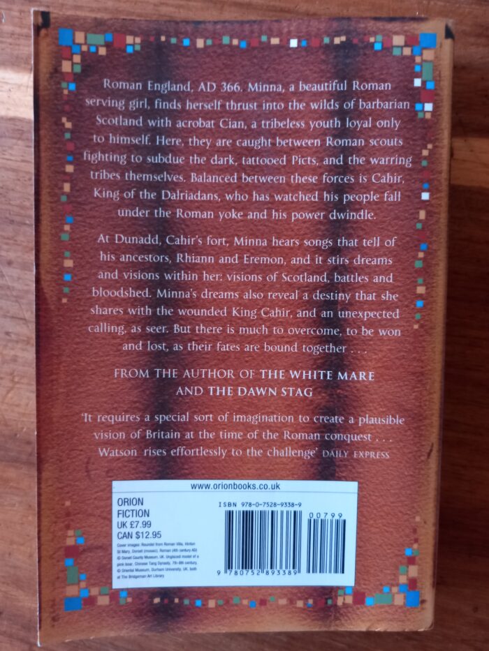 Desperate to find her brother, Minna falls in with Cian, an aloof but charming young acrobat. A terrible mistake thrusts the pair into slavery in the wilds of barbarian Scotland, where the Romans wage war on the violent, blue-tattooed Picts in Eastern Scotland. Cahir, King of the Dalriadans of western Scotland, is caught in the middle of a war that will seal the fate of the Scots. Year by year, Cahir has watched in shame as his people fall under the Roman yoke. Now Cian and Minna, unwilling prisoners at Cahir’s fort, must fight for their survival. And despite her loyalties to her Roman blood, as the war for Scottish freedom unfolds, Minna struggles against another force–an irresistible call of her blood that reveals a destiny she shares with the wounded king Cahir, and which binds her inevitably to the people who have enslaved her.