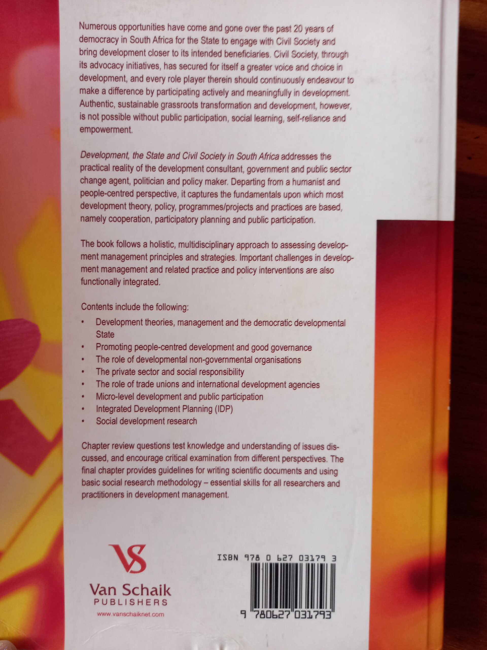 Development, the State and Civil Society in South Africa addresses the practical reality of the development consultant, government and public sector change agent, politician and policymaker. Departing from a humanist and people-centred perspective, it captures the fundamentals upon which most development theory, policy, programmes/projects and practices are based, namely cooperation, participatory planning and public participation.