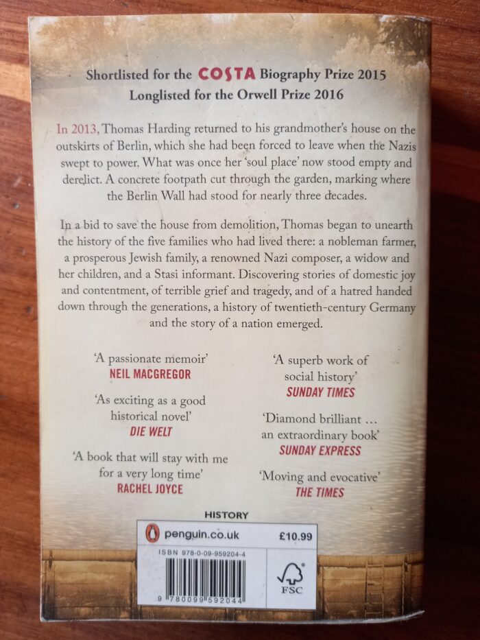 In the summer of 1993, Thomas Harding travelled to Germany with his grandmother to visit a small house by a lake on the outskirts of Berlin. It had been her ‘soul place’ as a child, she said – a holiday home for her and her family, but much more – a sanctuary, a refuge. In the 1930s, she had been forced to leave the house, fleeing to England as the Nazis swept to power. The trip, she said, was a chance to see it one last time, to remember it as it was. But the house had changed. Nearly twenty years later Thomas returned to the house. It was government property now, derelict, and soon to be demolished. It was his legacy, one that had been loved, abandoned, fought over – a house his grandmother had desired until her death. Could it be saved? And should it be saved?