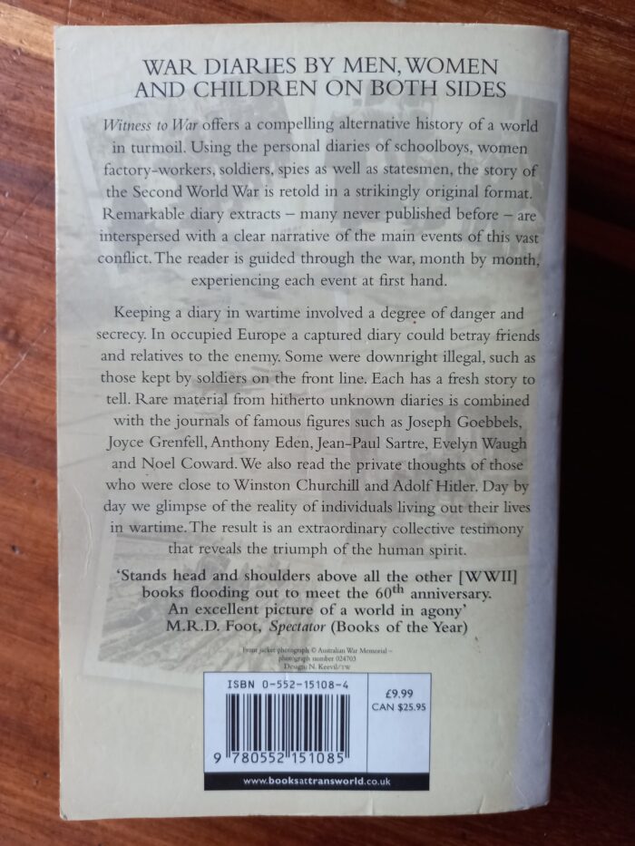 Rare material from hitherto unknown diaries is combined with the journals of famous figures such as Joseph Goebbels, Joyce Grenfell, Anthony Eden, Jean-Paul Sartre, Evelyn Waugh and Noel Coward. We also read the private thoughts of those who were close to Winston Churchill and Adolf Hitler. Day by day we glimpse of the reality of individuals living out their lives in wartime. The result is an extraordinary collective testimony that reveals the triumph of the human spirit.